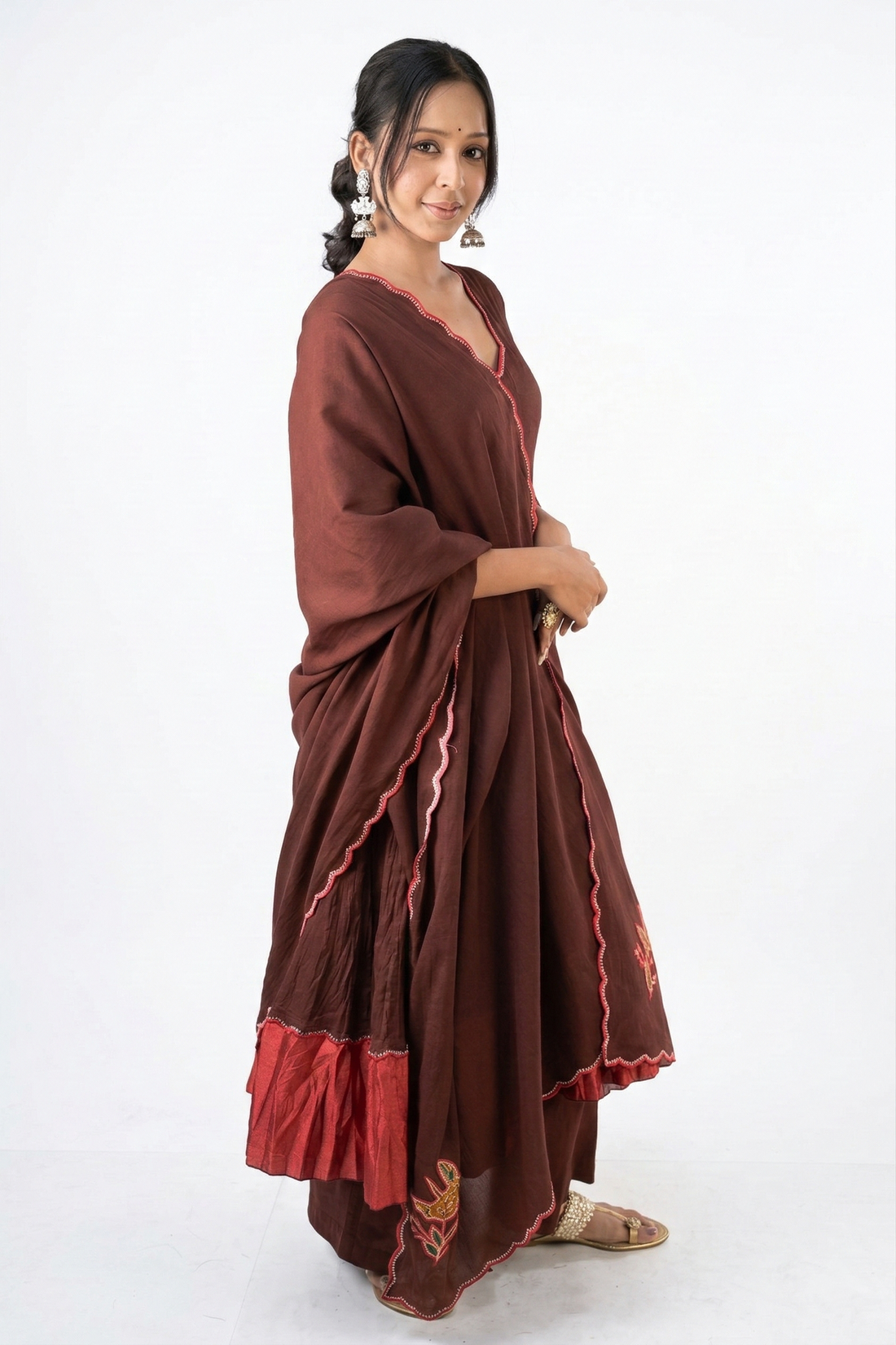 The Barkha Co-ord Set comes as a 3-piece set in Malai Chanderi. The flared kali...