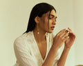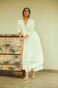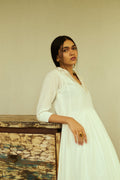 An airy mul kurta set with delicate floral detailing on the neckline, highlighted by heavy mukesh work. Fine pleats on the front panel add soft structure, creating a graceful, easy silhouette. Light, breathable, and quietly elegant.