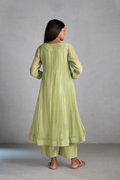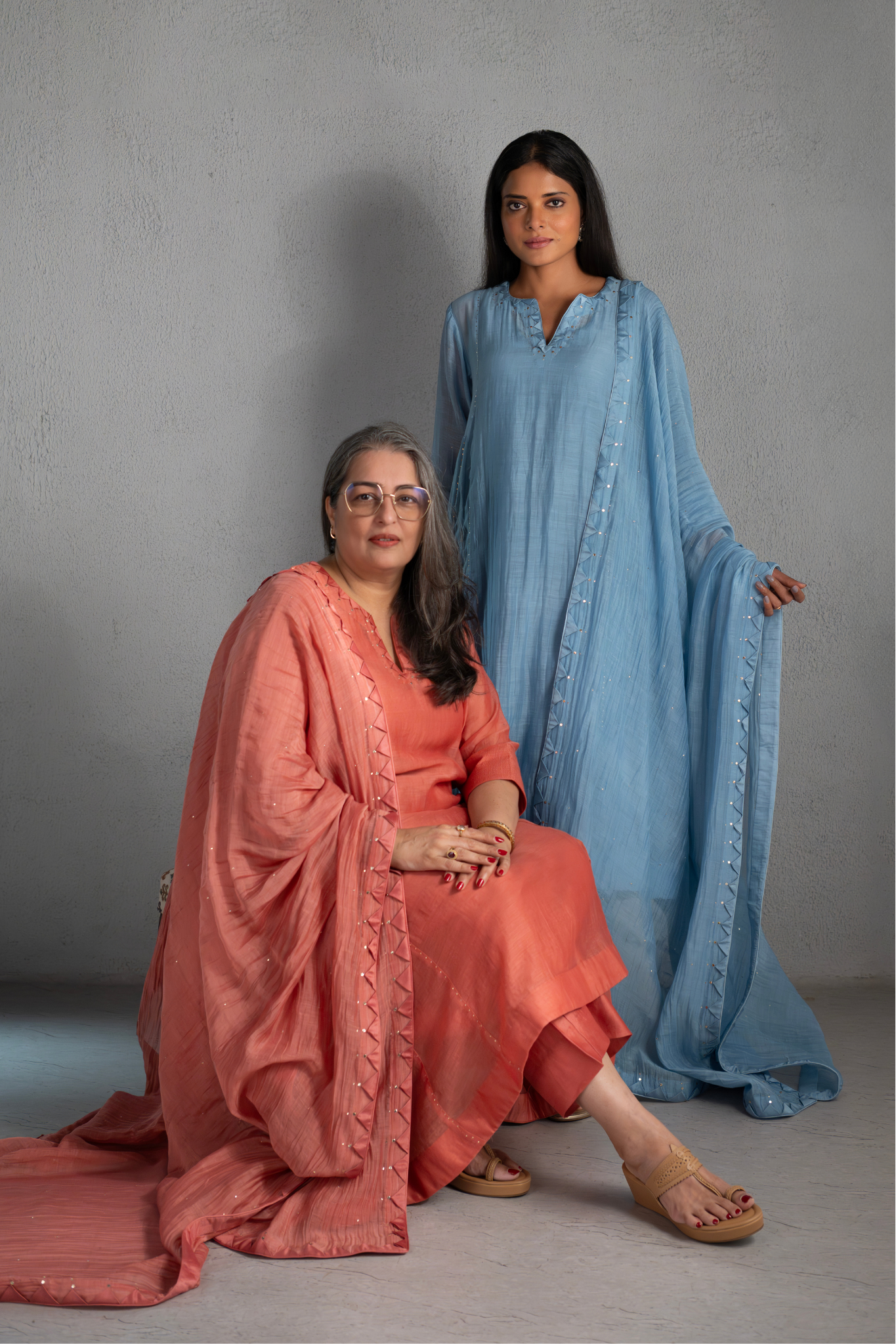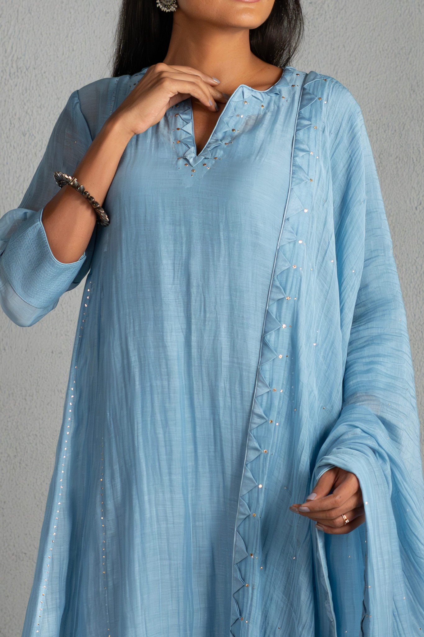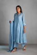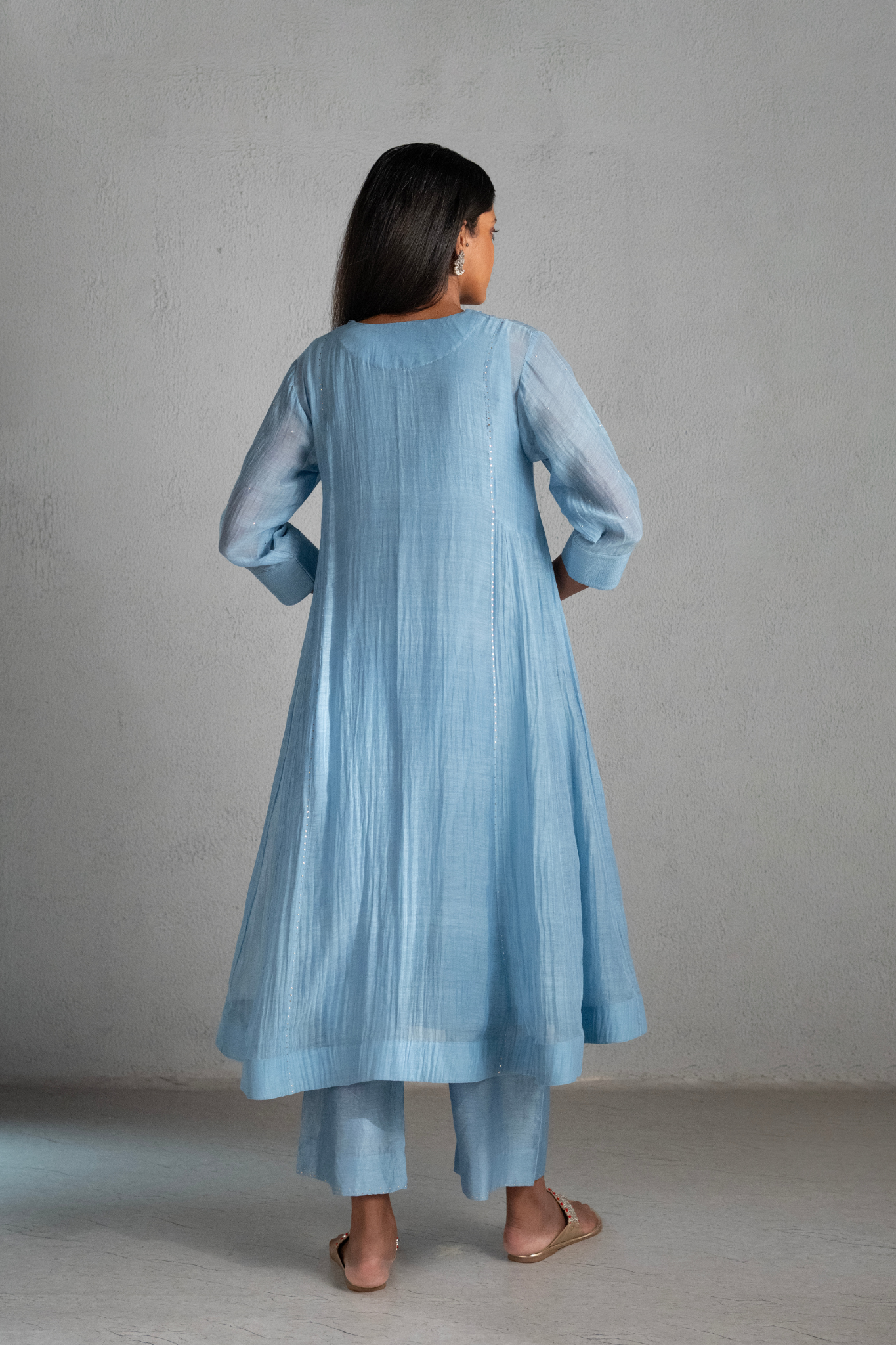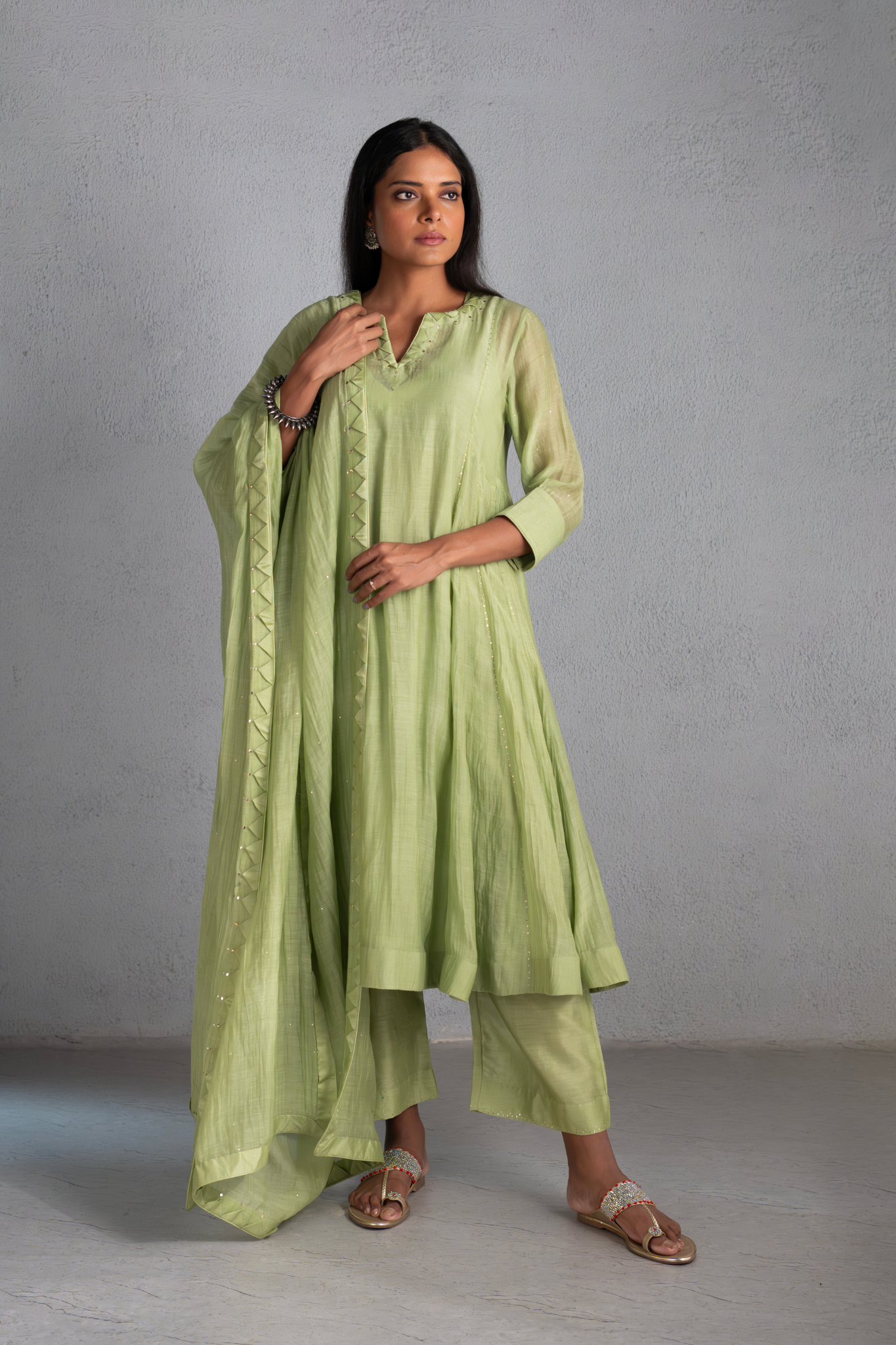 The Barkha Co-ord Set comes as a 3-piece set in Malai Chanderi. The flared kali kurta and dupatta feature mokiesh work, with Aarka detailing on the neckline and dupatta. It is paired with a straight palazzo.