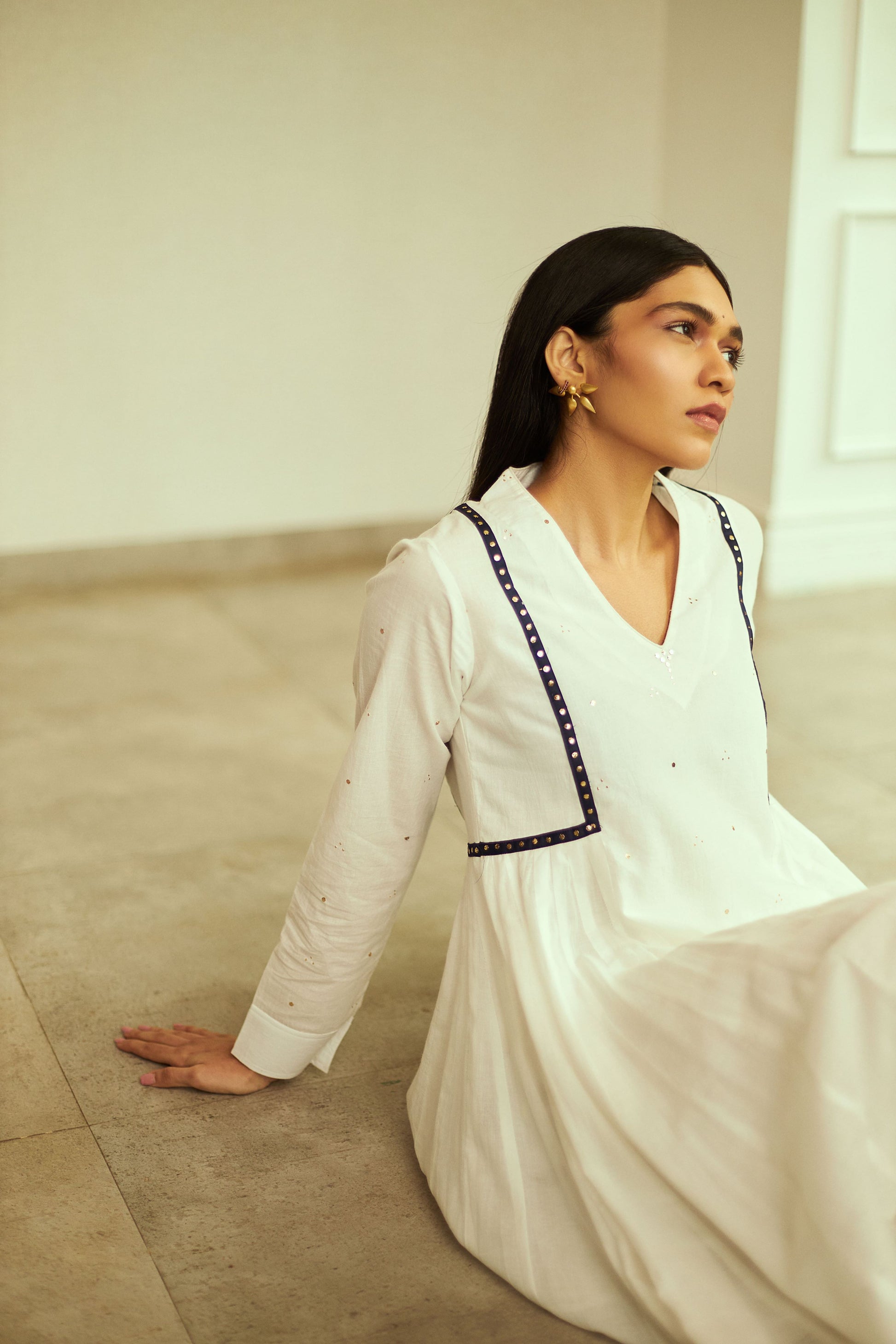 White mul cotton kurta set with delicate mukesh embroidery and contrast blue trimmings.