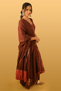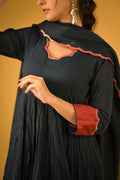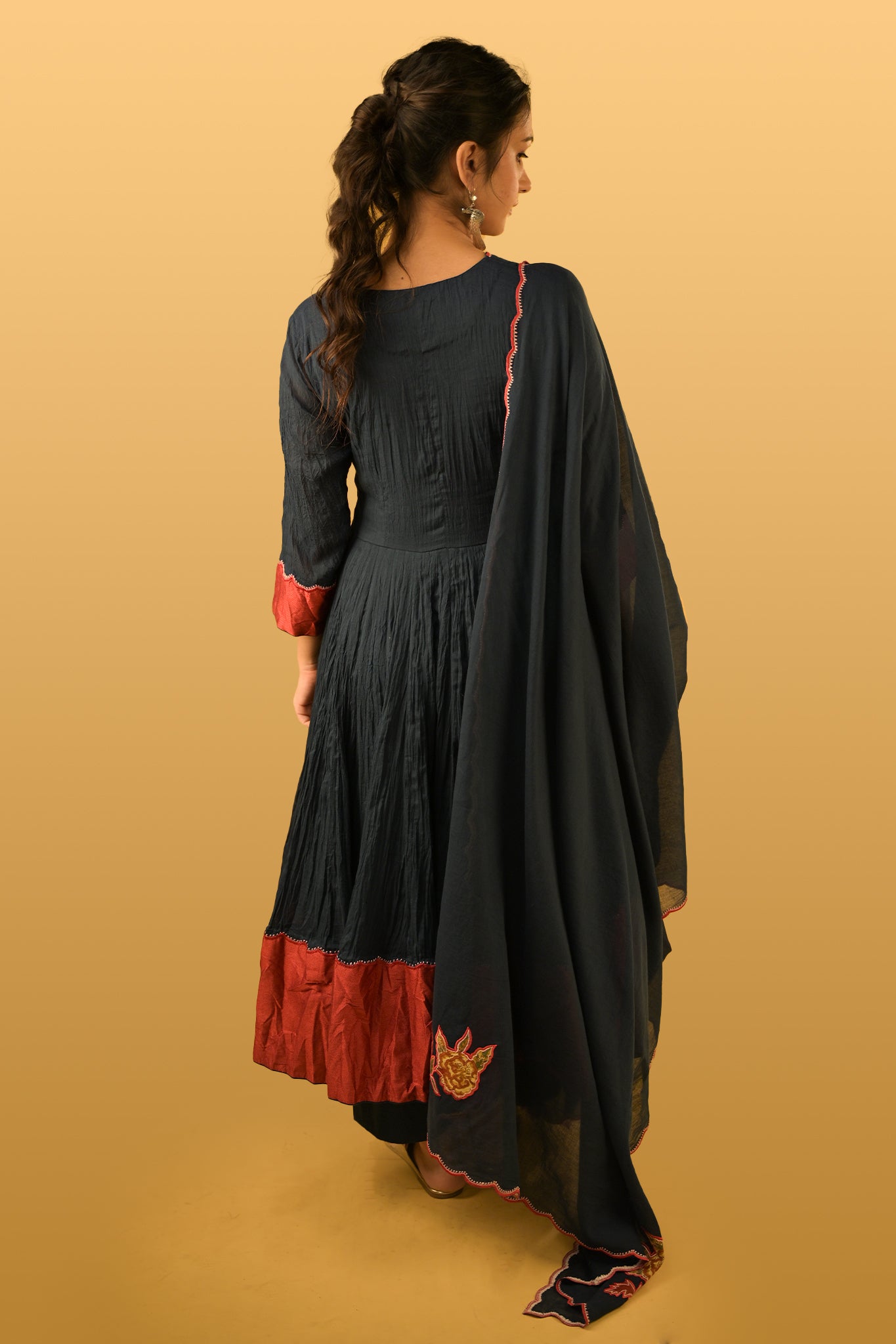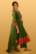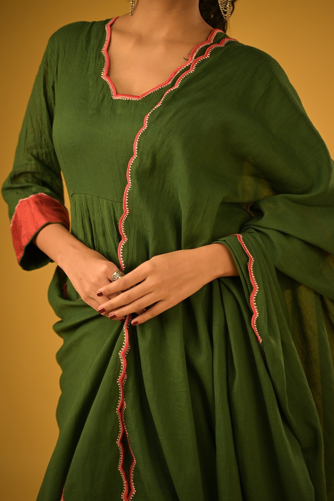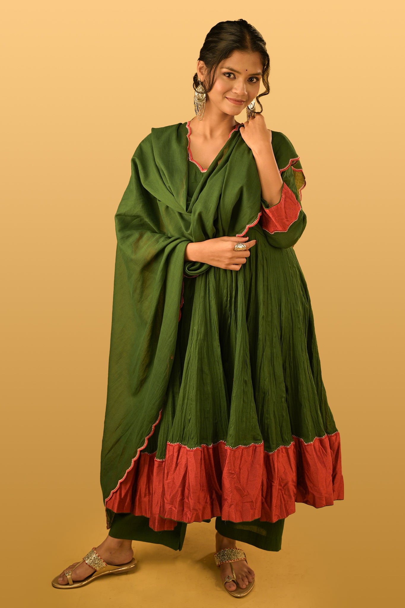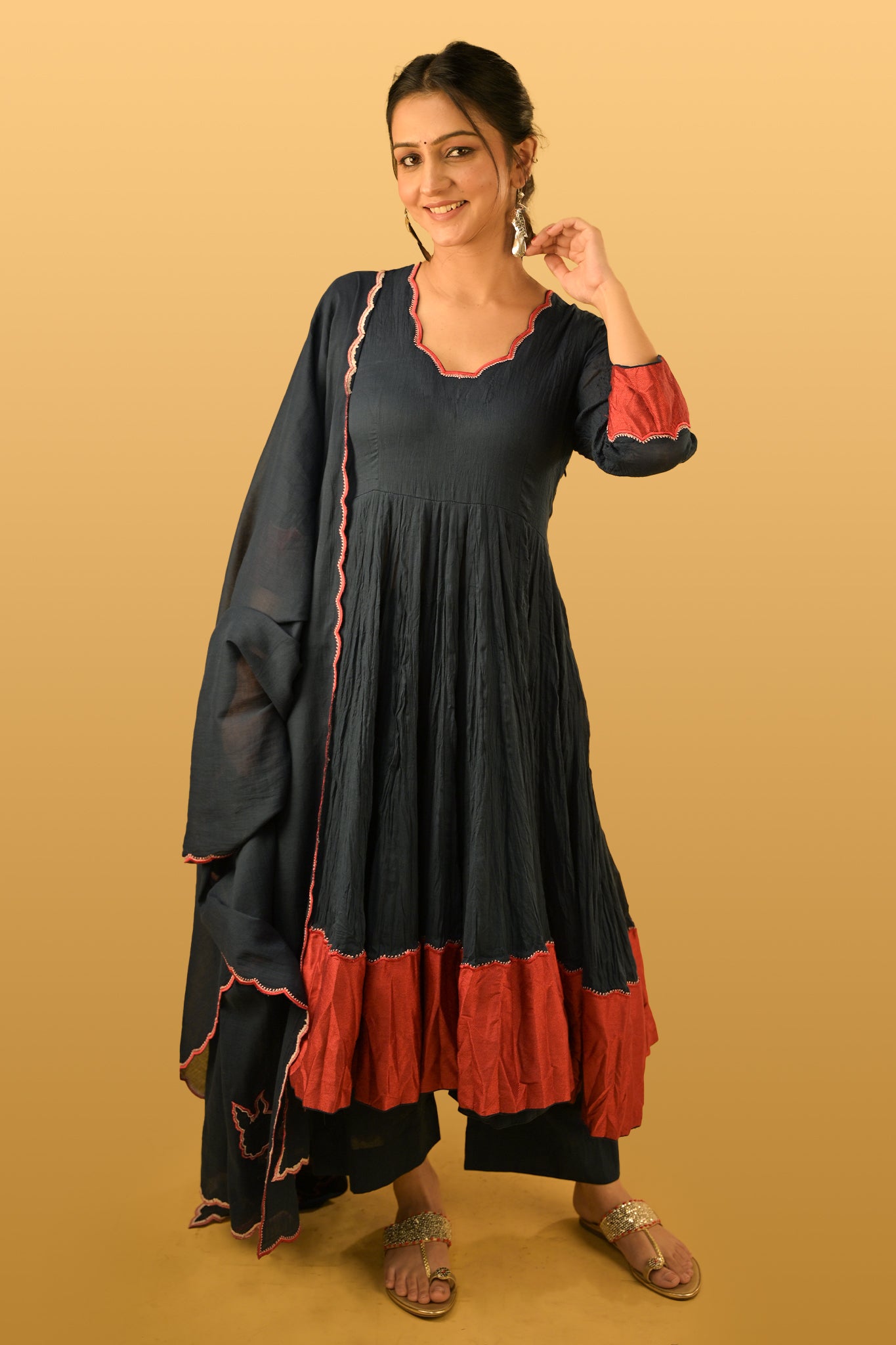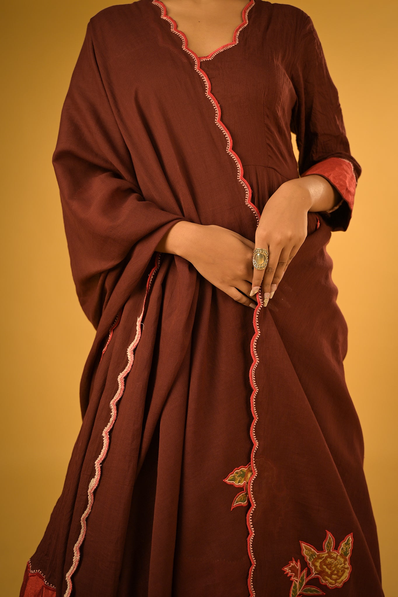 The Kusum Co-ord Set is a 3-piece set in soft Mul featuring a 64 kali kurta with scallop detailing on the neckline. The kurta carries a red brocade banarsi 8 inch border. The dupatta is adorned with floral patches and scallop detailing.