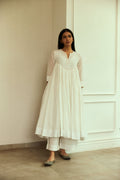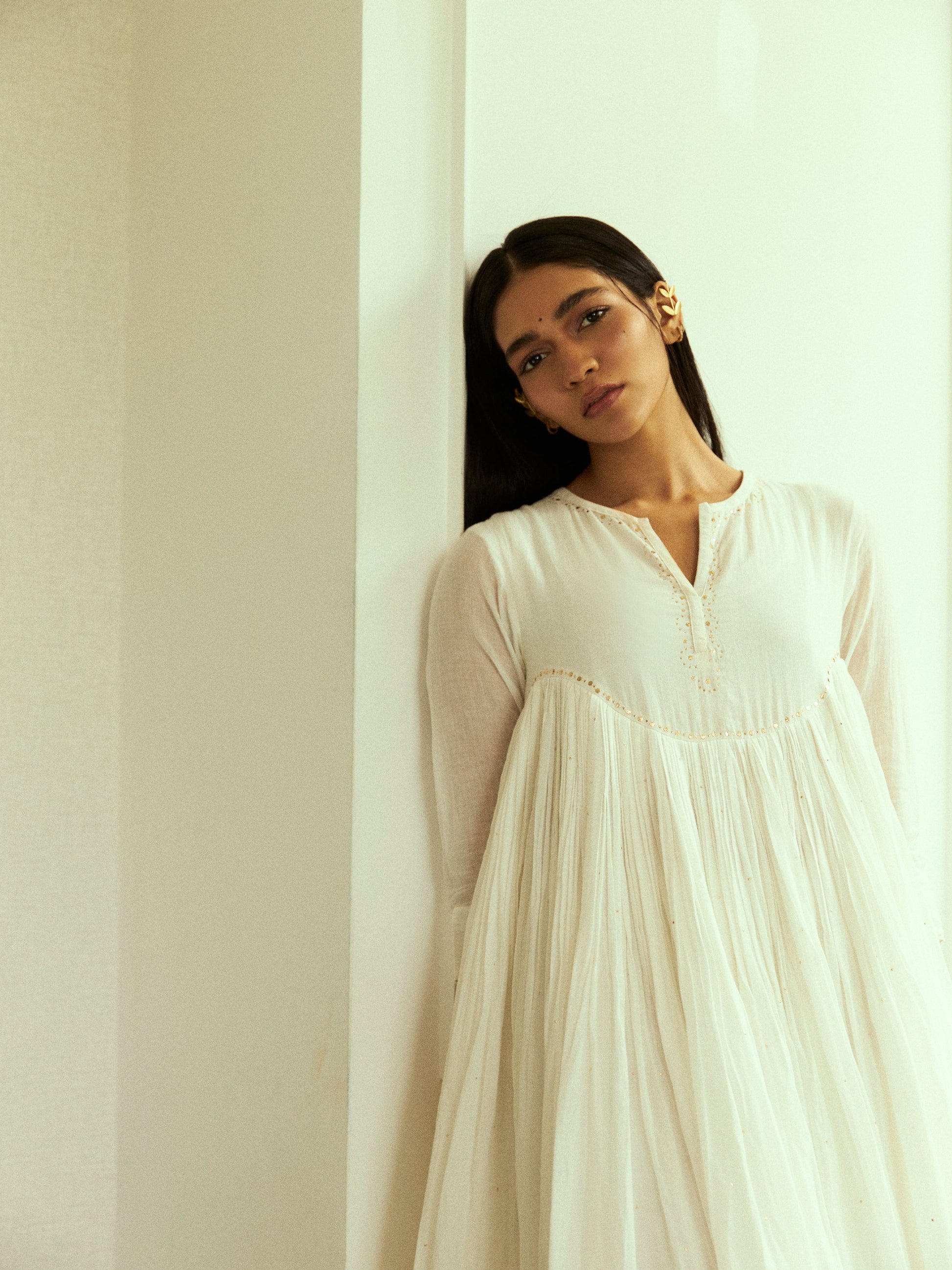 A flowing white kurta crafted in soft mal cotton, detailed with delicate mukesh work along the neckline and yoke.