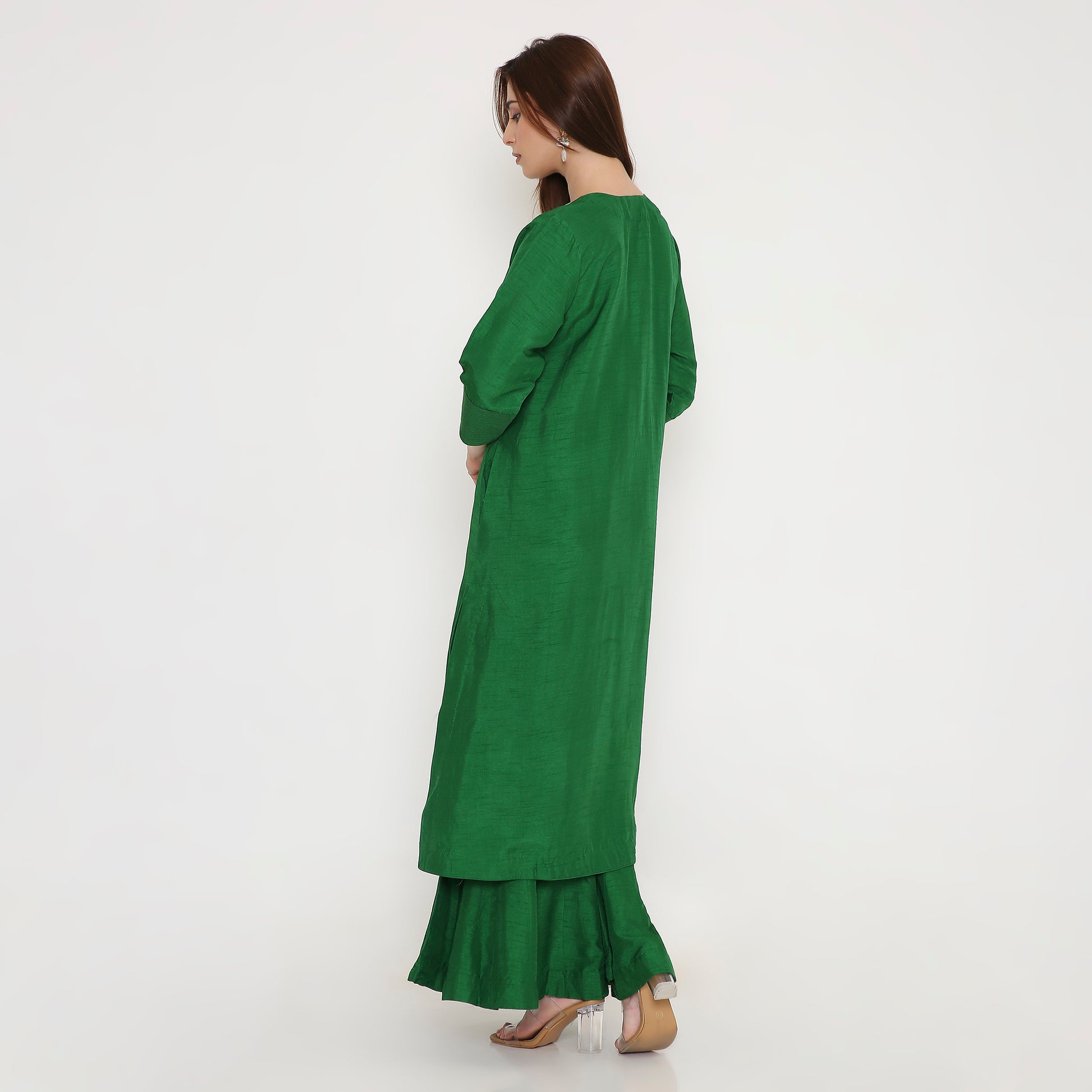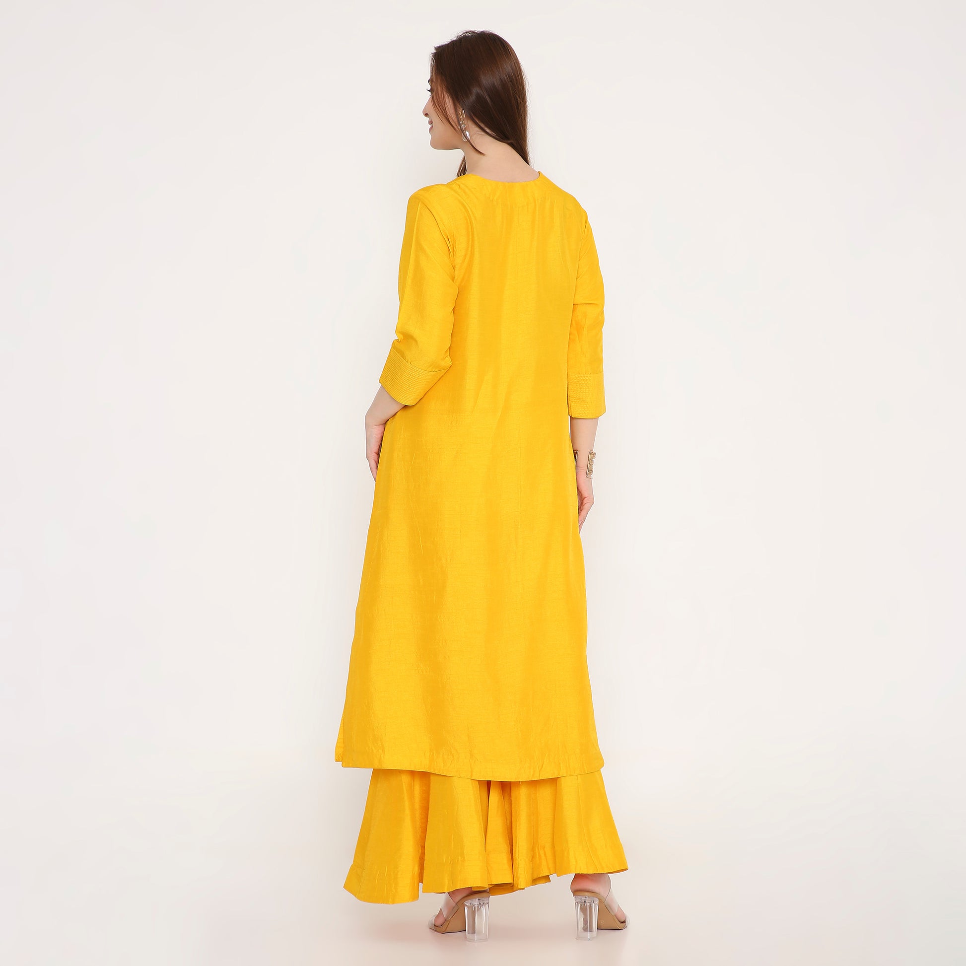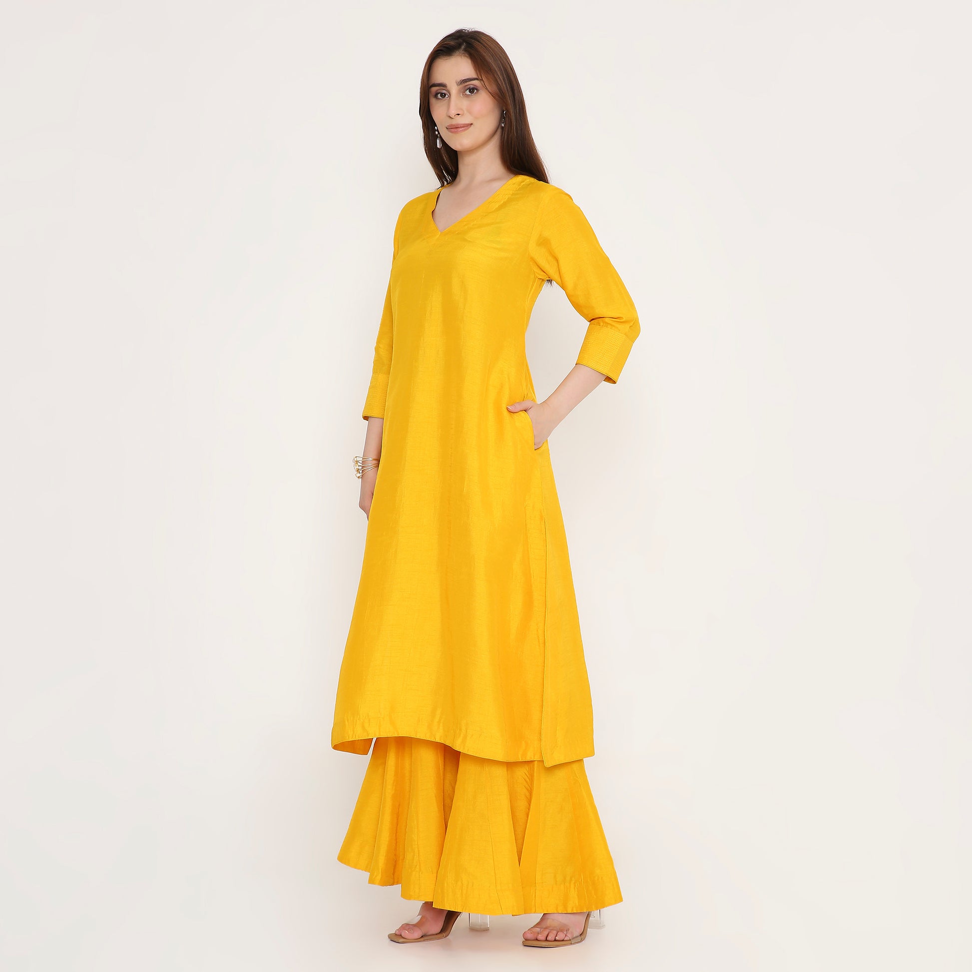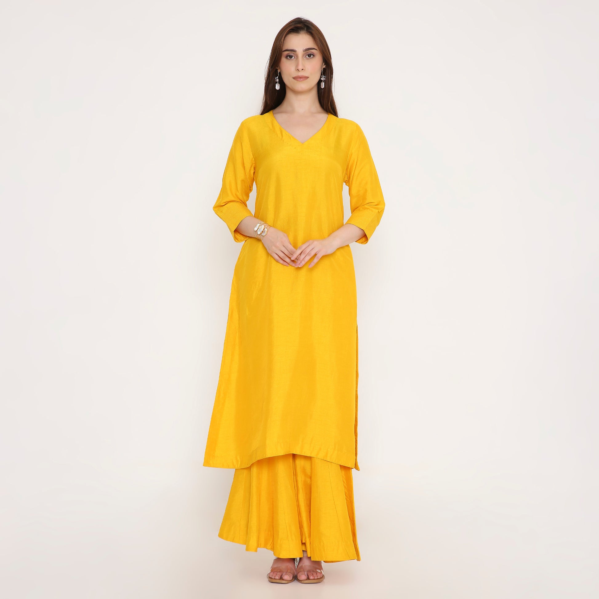 Crafted in Slub Silk, the Padma co-ord set features an A-line kurta with a flattering V-neck and side pockets, paired with a flared kali palazzo for added movement and flair.