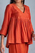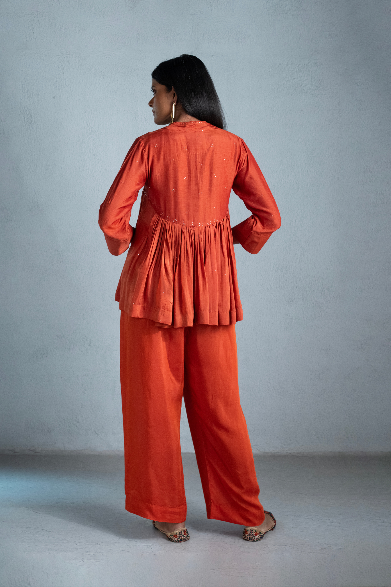 The Pataka Co-ord Set features a short flared tunic paired with straight palazzos, made in soft modal silk. The tunic is highlighted with delicate Mokiesh work, making it a simple yet a striking festive look.