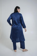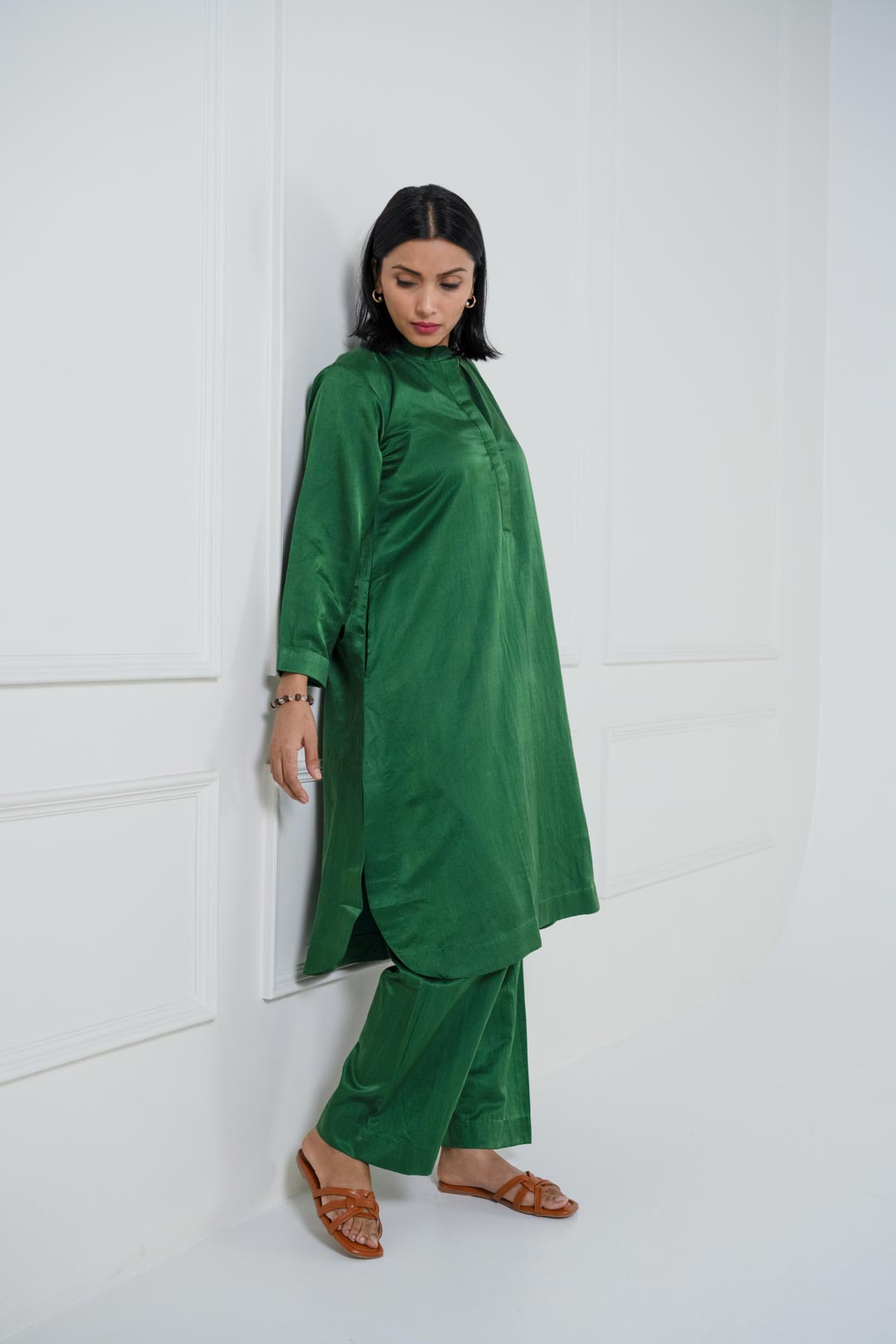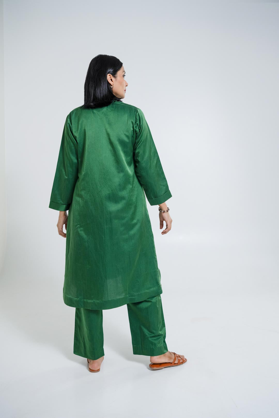 The Raag co-ord set, crafted in breathable cotton satin, features a side pocket kurta paired with straight pants.