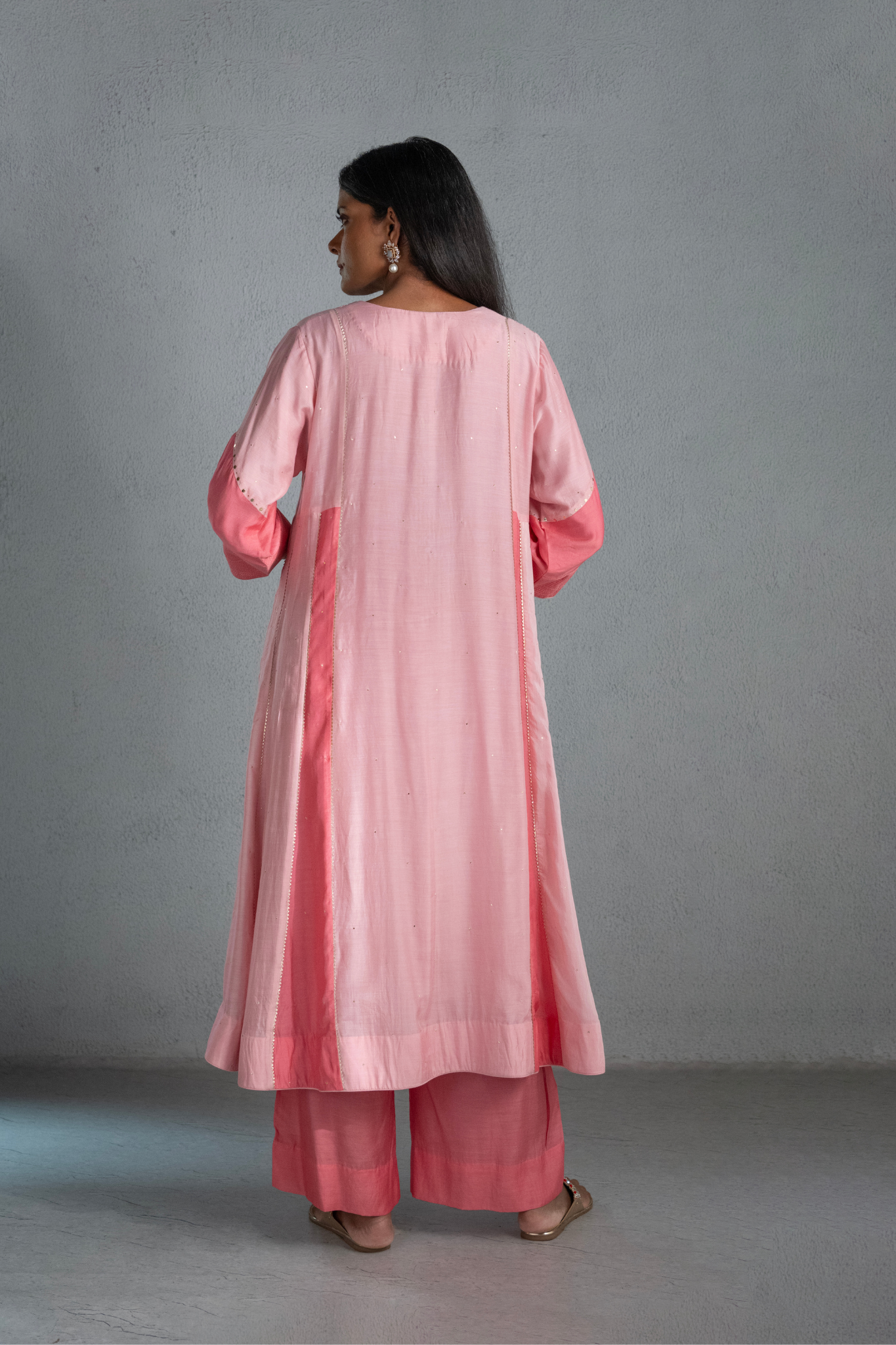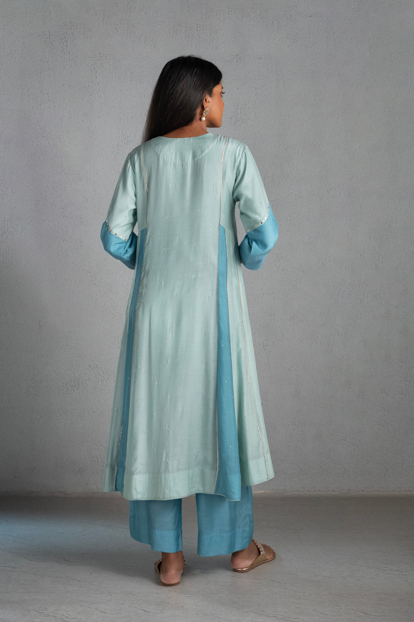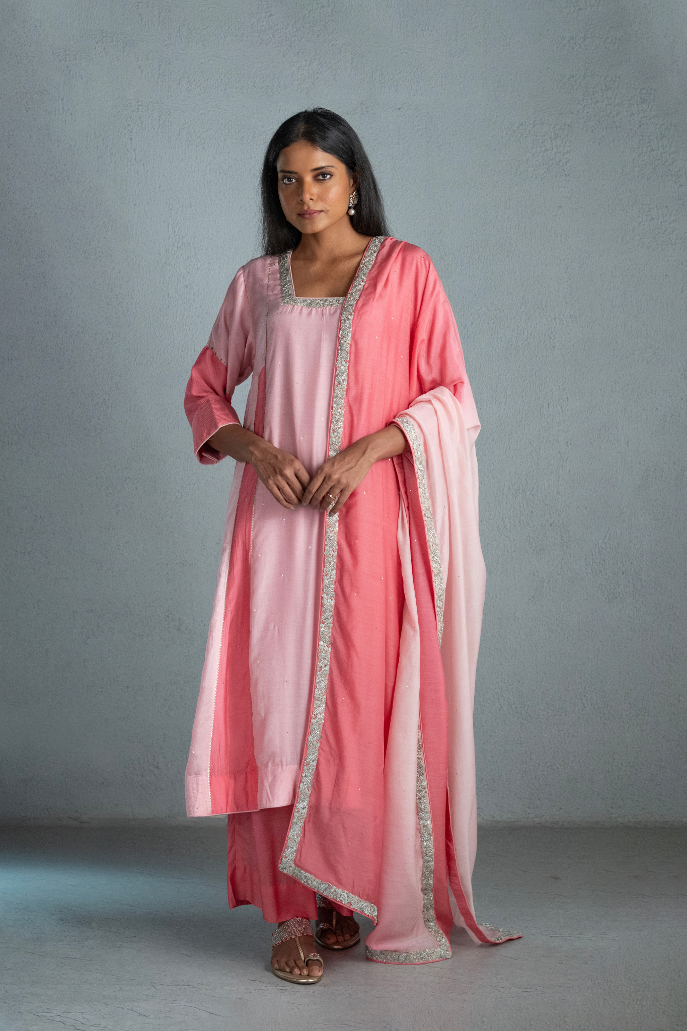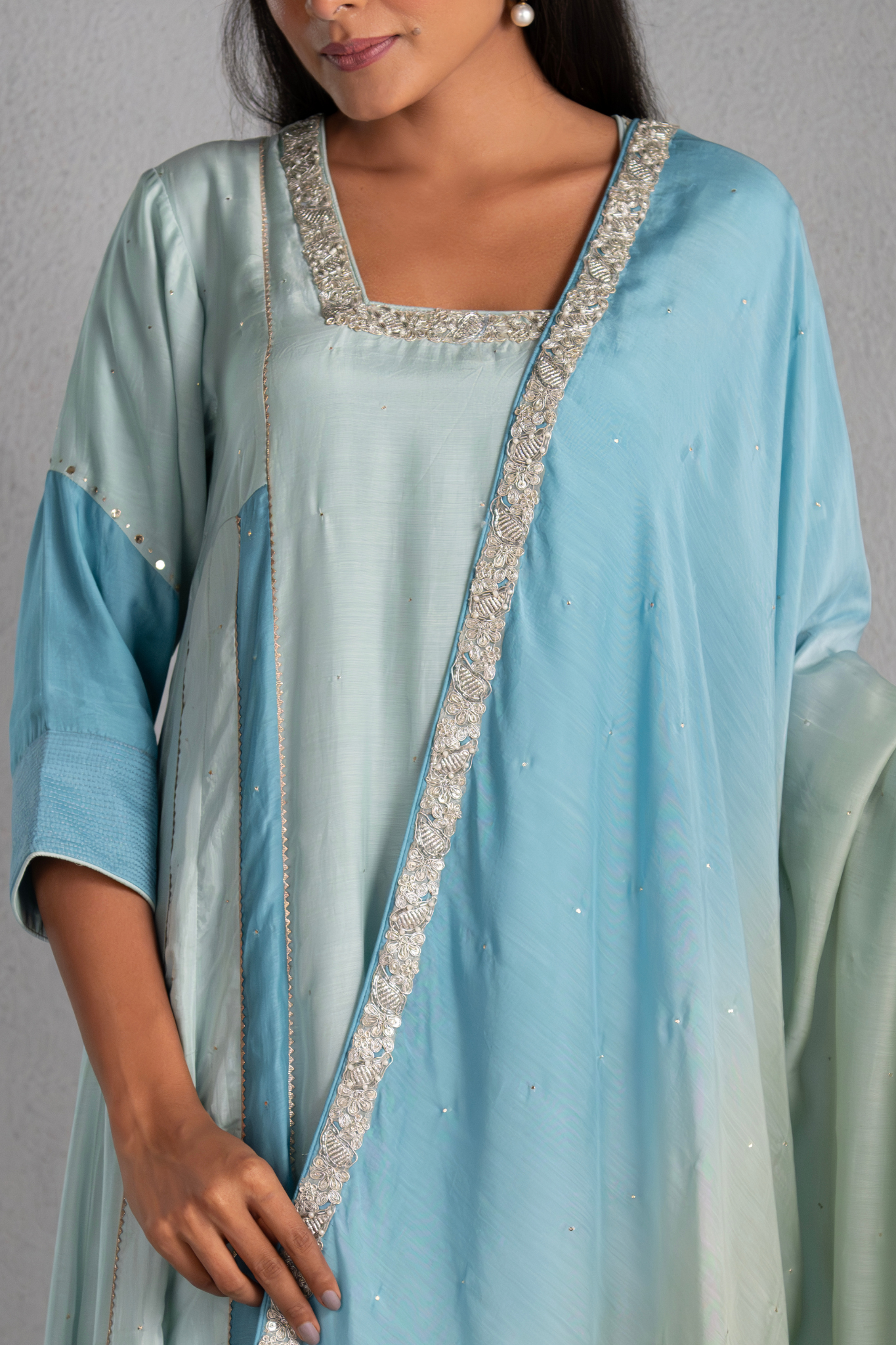 The Raas Co-ord Set is a flared kali kurta paired with straight palazzos and a shaded dupatta. Crafted in luxurious modal silk, it is adorned with delicate mokiesh work and finished with elegant lace trimmings.