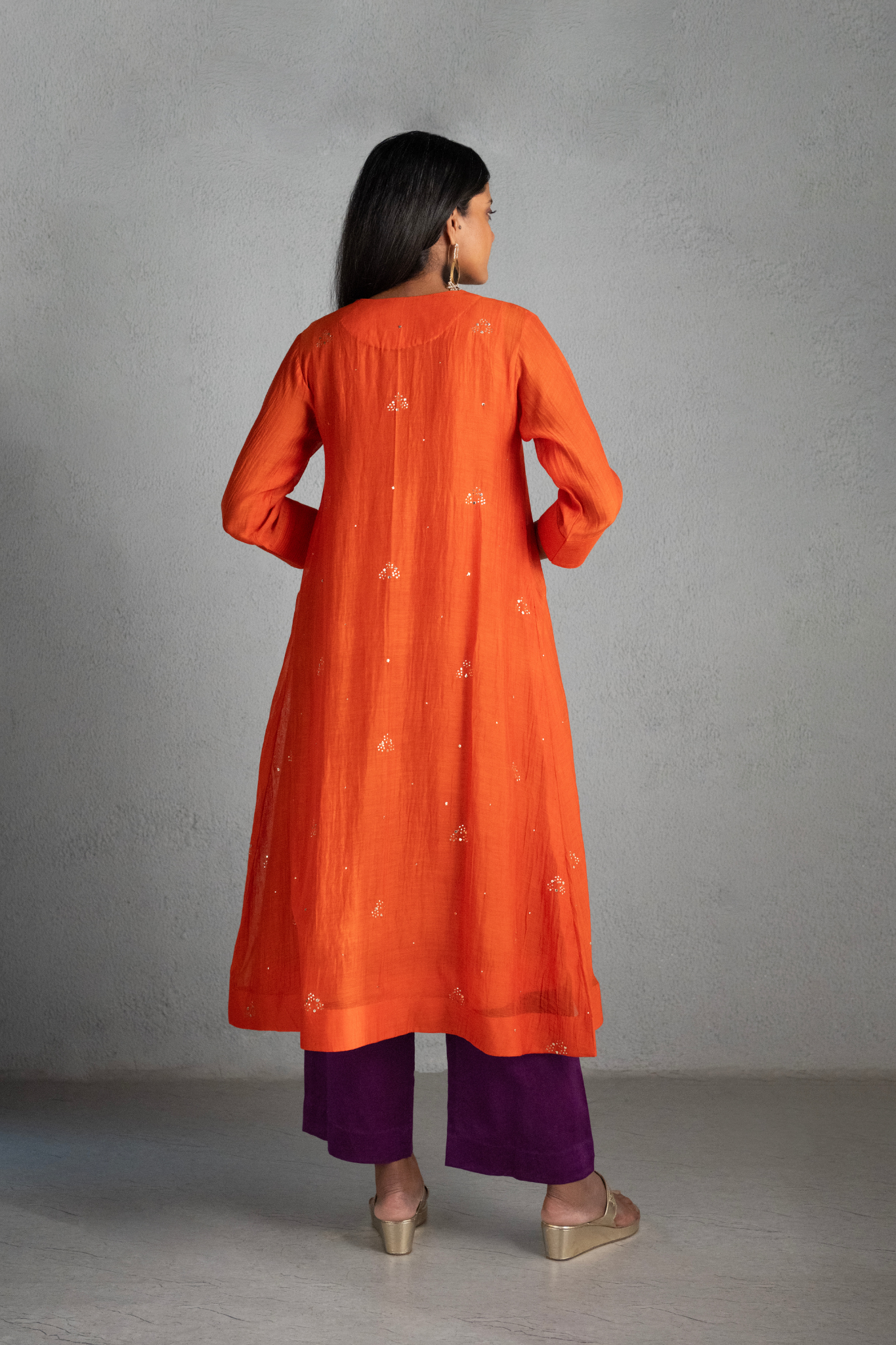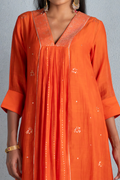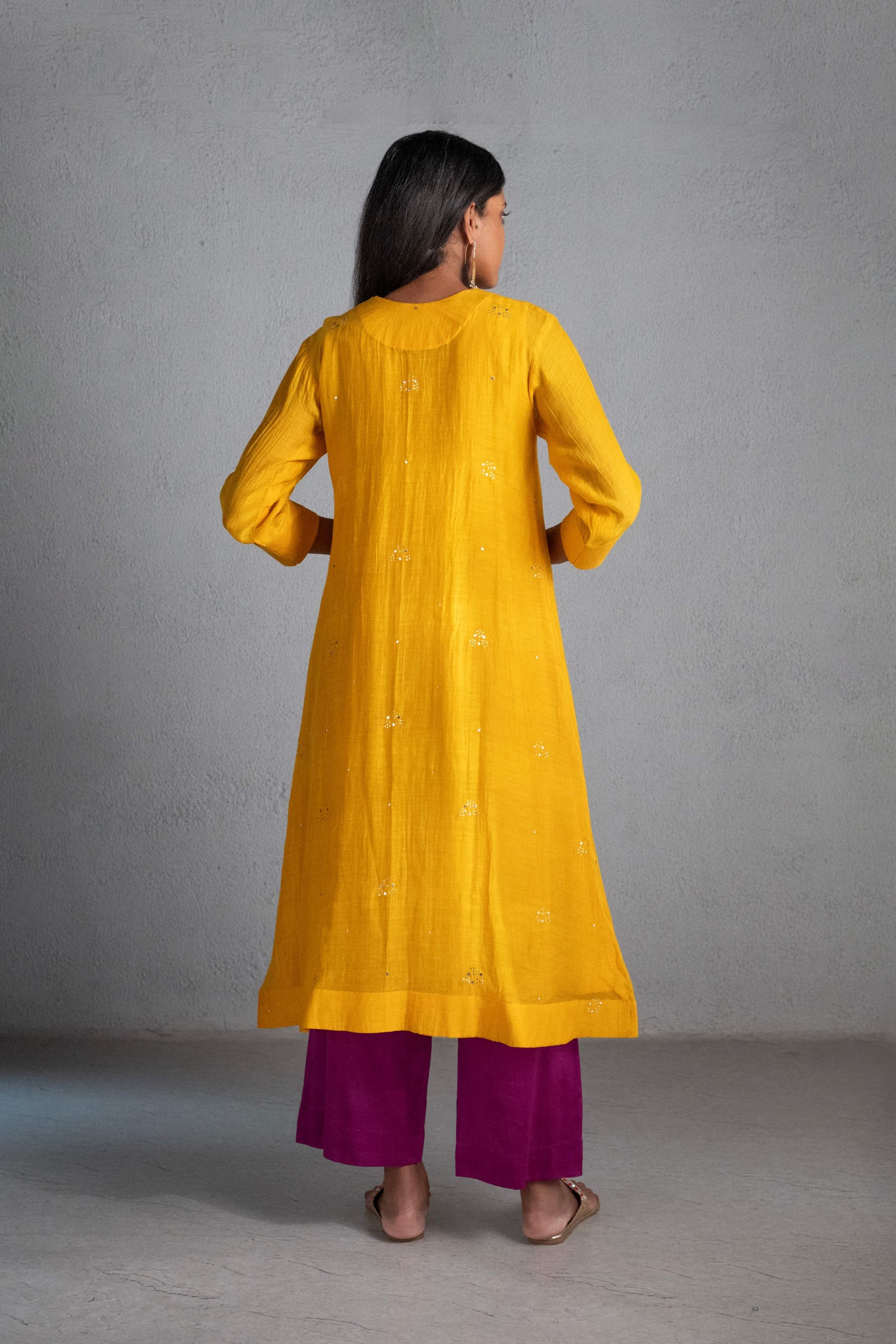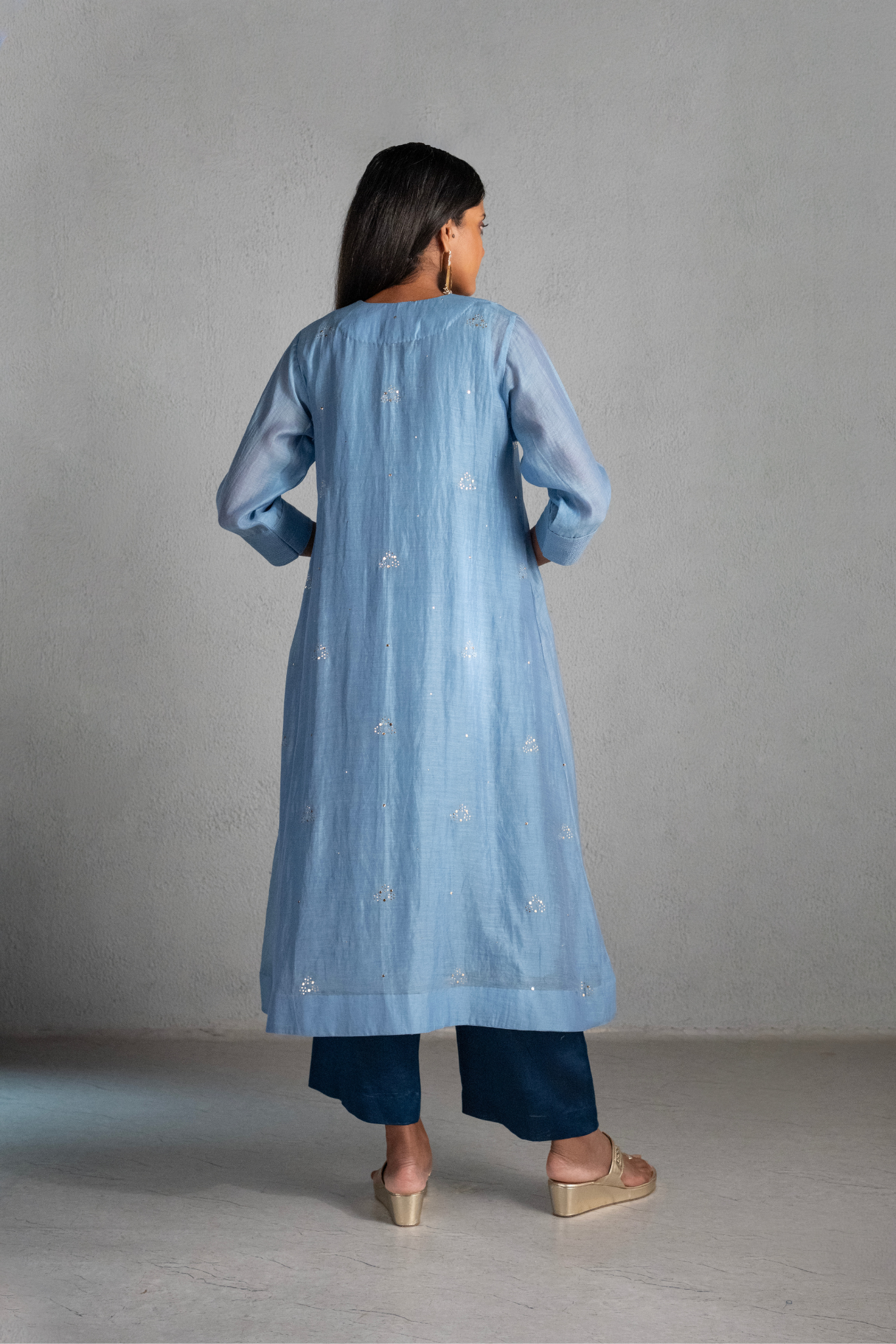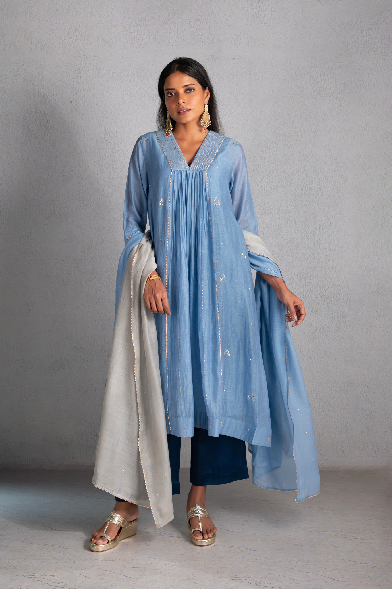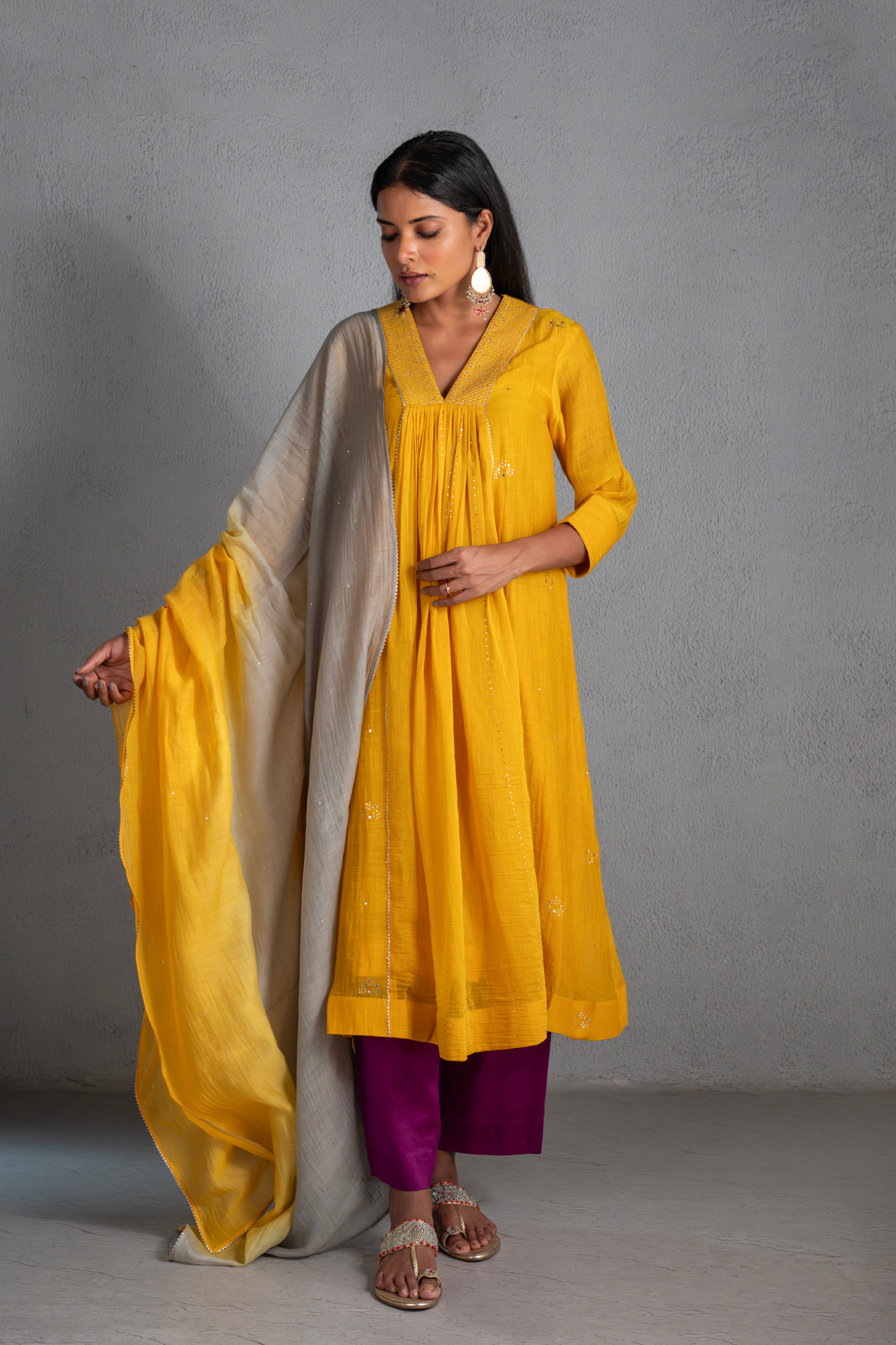 The Ruhi Co-ord Set is crafted in Malai Chanderi, featuring a gathered yoke kurta with a textured V-neckline, Mokiesh work and Champa lace detailing. It is styled with a contrast colour palazzo and a shaded dupatta, making it a complete festive set.