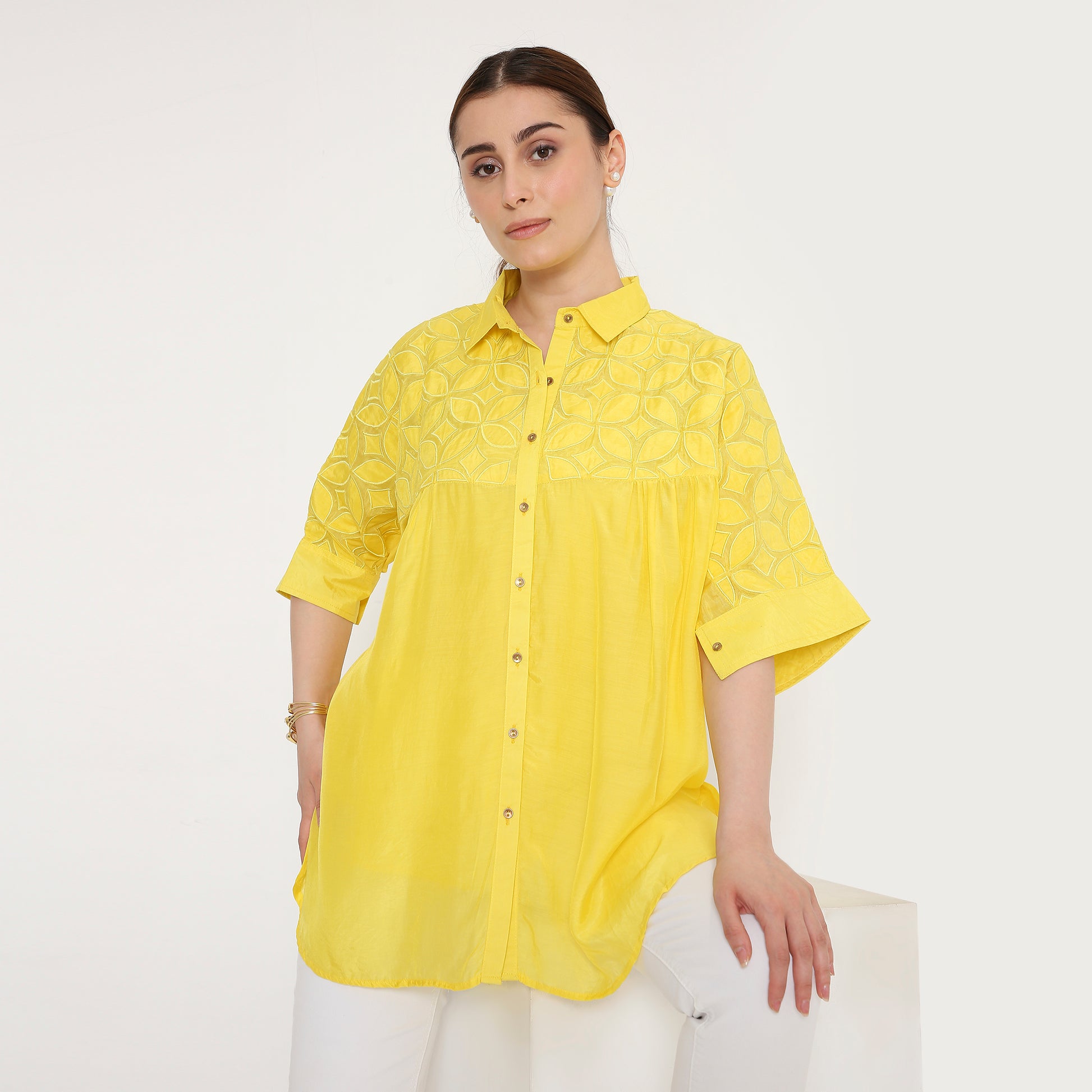 The Samdipth shirt — crafted in Modal Silk with geometric patchwork.