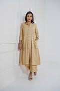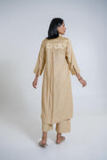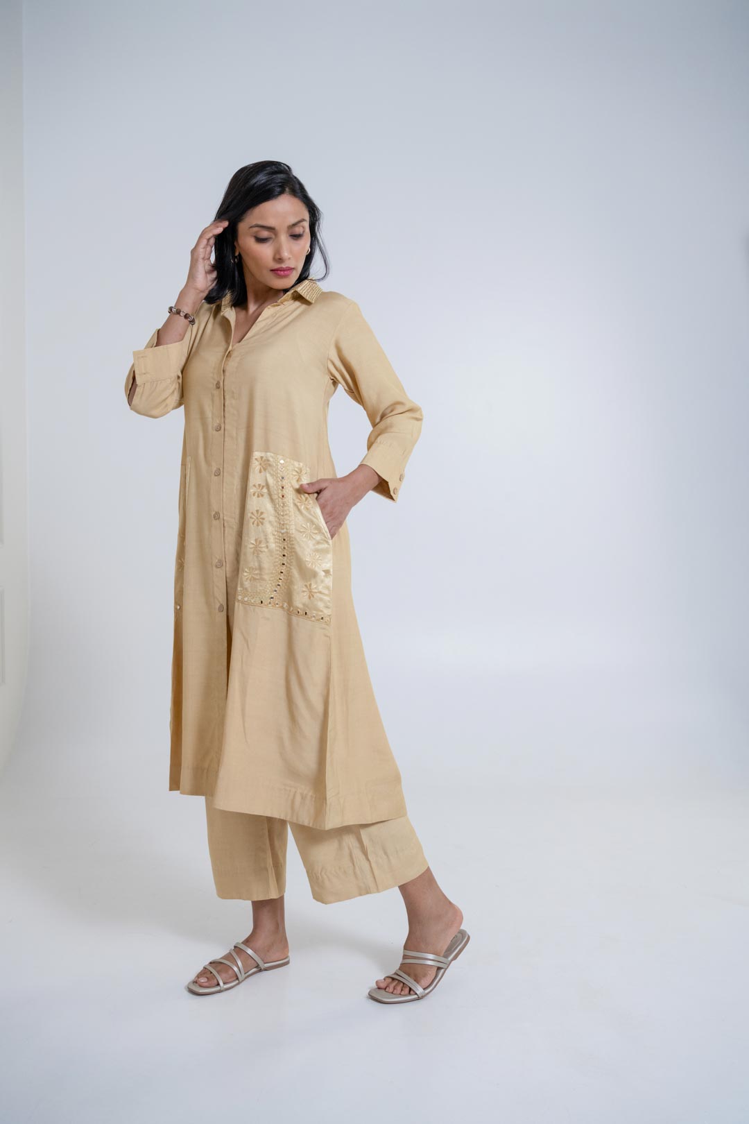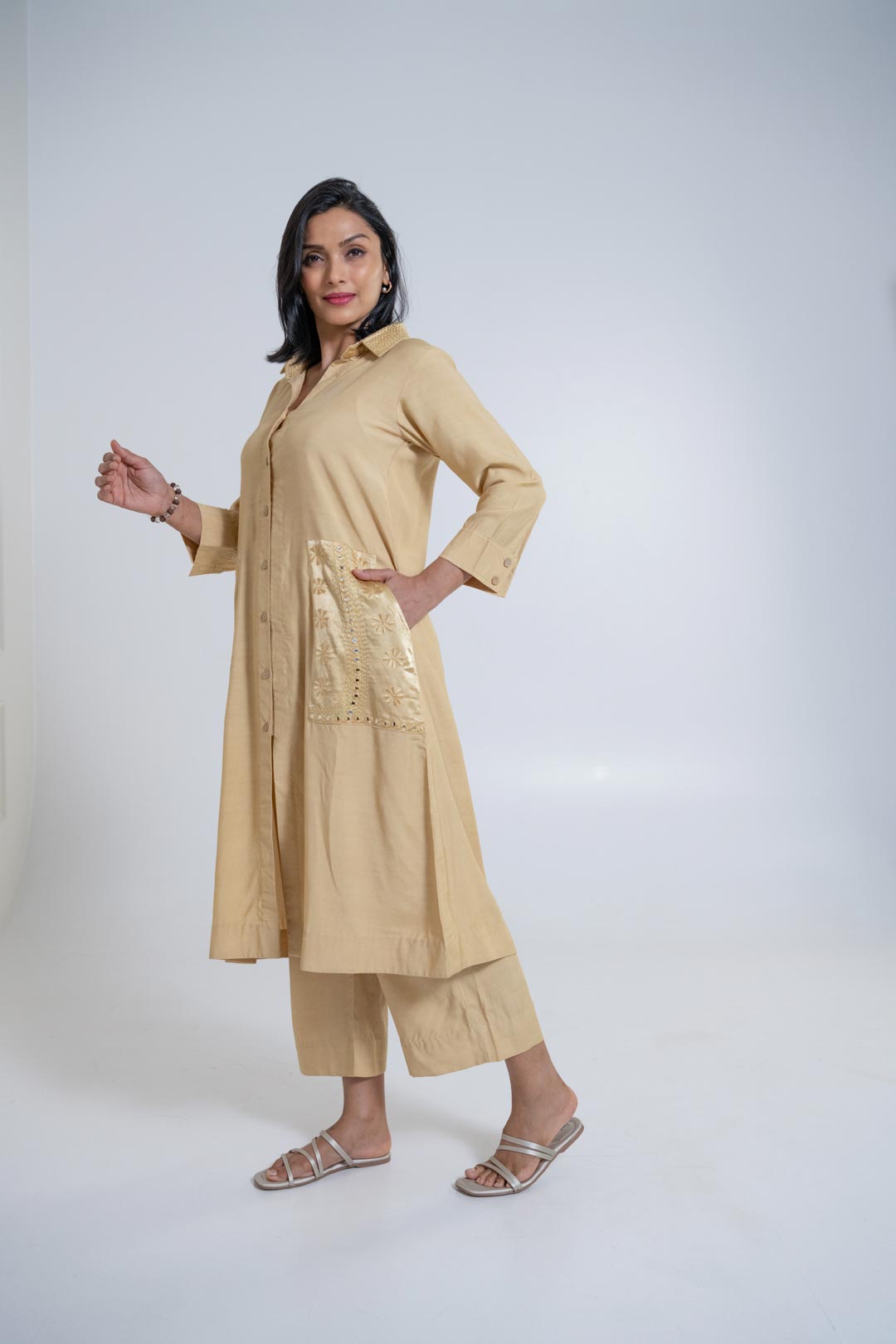 The Sukoon Co-Ord Set, crafted in lightweight muslin, features a button-down kurta with mushroo collar and front patch pockets paired with a matching palazzo.